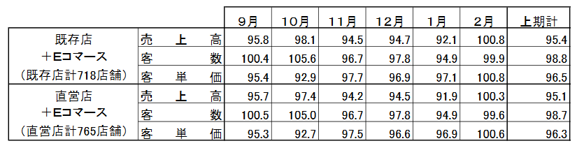 既存店(718店)+Eコマースは、客数が前年同月比99.9%、客単価が100.8%、売上げは100.8%だった。