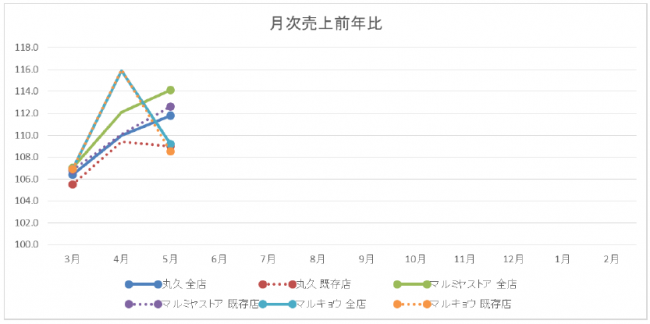 マルミヤストアの既存店売上高は112.6%で、客数101.9%、客単価110.5%と高い伸びを見せた。全店も114.1%だった。
