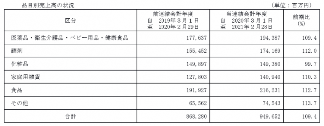 物販面では、テレワーク等による化粧品メイク需要の減少などの影響があり、化粧品部門の売上高は前年比0.3%減少した。しかし、感染症予防対策商品や食品の需要増によって全体売上高は好調に推移した。食品部門は前期比12.7%増、家庭用雑貨は10.3%増加した。