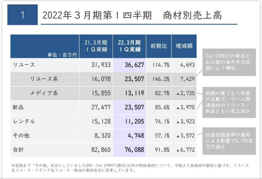 ゲーム機本体とゲームソフトを主力とする新品商材は、前期に発生した巣ごもり特需からの反動で売上げは減少した。