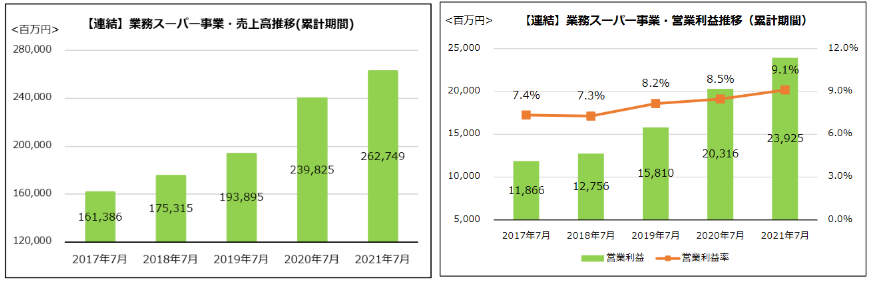 業務スーパー事業の売上高は2627億4900万円(同9.6%増)。出店が加速したことやメディアやSNSの影響もあり、前年よりプライベートブランド(PB)比率が上昇した。これを支えるのが国内の自社グループ工場数は25工場だ。2021年1月に宮城県、4月に岡山県で食品製造工場を稼働させている。