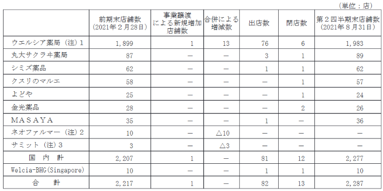 3月1日付でウエルシア薬局(株)を存続会社として、愛媛県を中心に四国エリアで調剤事業を展開する完全子会社の(株)ネオファルマーと(株)サミットを吸収合併した。