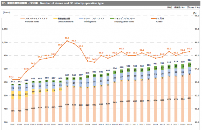 9月30日時点で、フランチャイズストア(加盟店A契約店舗)が前期末より20店舗増えて881店舗、直営店(加盟店B契約店舗、トレーニング・ストア、ショッピングセンター店舗)は2店舗減って43店舗となった。46都道府県下に合計924店舗を展開している。このうちワークマンプラスが329店舗、#ワークマン女子が7店舗となった。