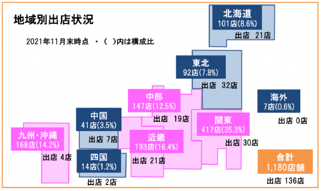 直営店舗では、引き続き商業施設・路面店を主軸として出店を推進し、売上高の拡大と収益体質の強化を目的とした委託店舗の出店をスタートさせた。FC店舗では、大手法人企業とのフランチャイズ契約による出店を進めた。新規出店実績は、136店舗(直営店87店舗、FC店49店舗)、退店が55店舗。11月末時点で1180店舗を運営する。内訳は直営店771店舗、FC店402店舗、海外FC店7店舗。