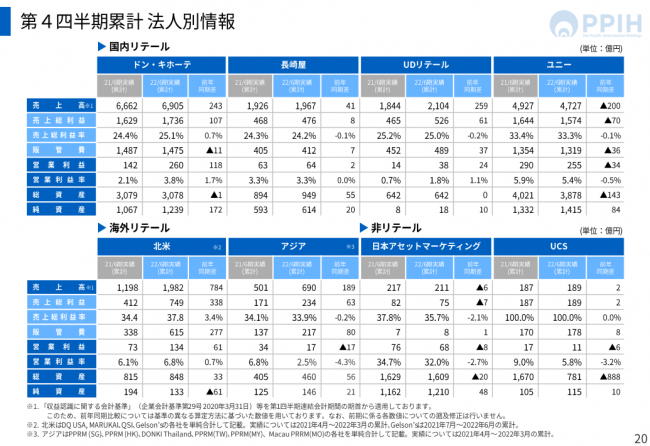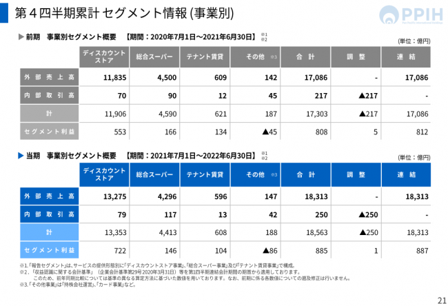 ディスカウントストア事業の売上高は、前年同期と比較し1439億2500万円増加して、1兆3274億5100万円(前年同期比12.2%増)、営業利益は722億3000万円(30.7%増)。