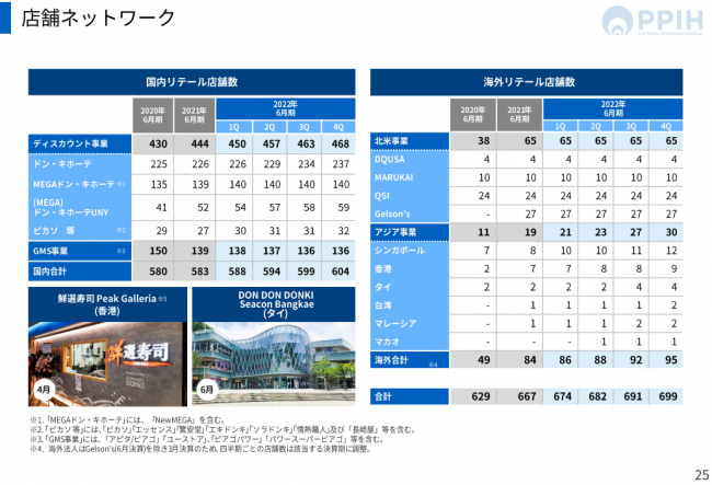 2022年6月末時点のグループ総店舗数は、国内604店、海外95店の計699店舗となり、前年6月末から32店舗増加している。
