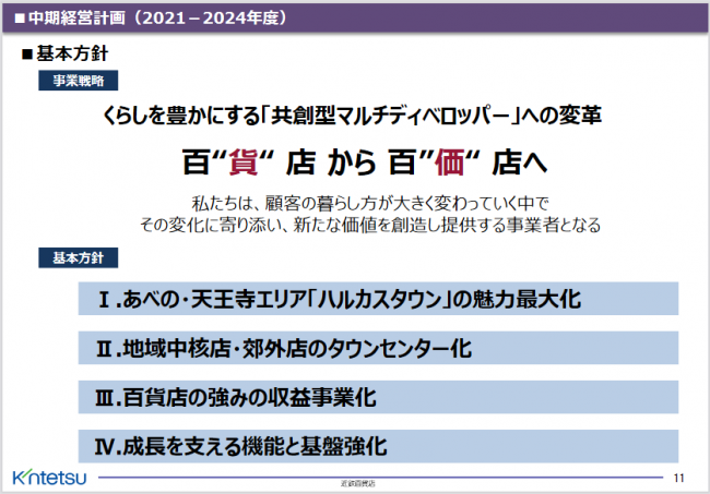 2021年4月に策定した中期経営計画(2021~2024年度)は「くらしを豊かにする共創型マルチディベロッパーへの変革 百“貨”店から百“価”店へ」をコンセプトとしている。これに基づき構造改革をさらに加速させ、新たなビジネスモデルの構築に取り組んでいる。