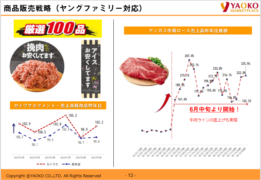 とくに、課題であるヤングファミリー層の対応として、EDLP(常時低価格施策)や「厳選100品」などの価格政策と売場づくりに取り組んだ。これらの施策から、ヤオコーのクラスター分析による最も年齢の低い「カイワケ」セグメントは伸長傾向にある。また輸入牛肉が高騰するなか、6月中旬からはアンガス牛肩ロースを強化して、販売額は前年比1.5倍から2倍の売上げで推移している。