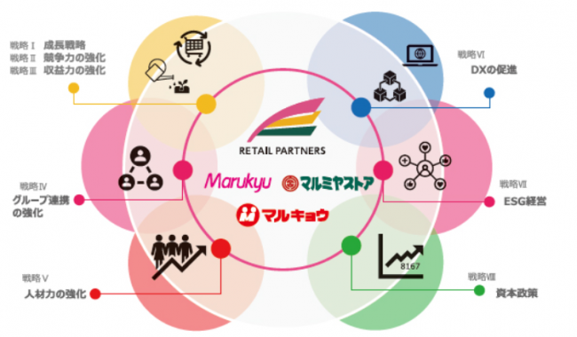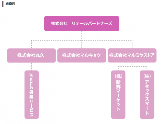 リテールパートナーズはスーパーマーケットの(株)丸久、(株)マルミヤストア、(株)マルキョウの3事業会社を傘下に擁する持ち株会社。