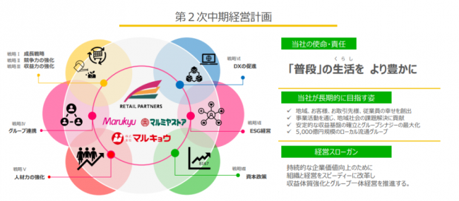 リテールパートナーズでは2022年2月期から2024年2月期までの3カ年で第2次中期経営計画を進めている。2023年2月期は2年目にあたる。基本戦略として、新規出店と既存店の計画的改装による成長戦略、アークスとバローホールディングスとの「新日本スーパーマーケット同盟」とのグループ力を生かした商品開発と消耗資材の共同調達による収益力の強化、DX戦略などが挙げられている。