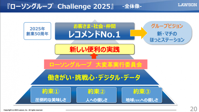 期中、創立50周年に当たる2025年に向けて策定した「Challenge 2025」実現に取り組んだ。2020年9月に立ち上げたローソングループ大変革実行委員会のもと、国内コンビニエンスストア事業では店舗改装や商品刷新を行うとともに、グループ全体で持続的な成長に向けた中長期課題の解決、新たな収益機会の獲得及び働きがいの向上などに取り組んだ。