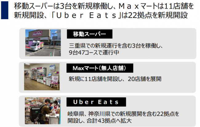 また「Uber Eats」を利用した商品配達サービスの拠点として、愛知県・静岡県に加え、新たに岐阜県・神奈川県を含めた22拠点を開設し、総計43拠点まで拡大した。2022年に静岡県で運行を開始した移動スーパーは、新たに三重県での運行を始めるなど、総計9台の運行となった。