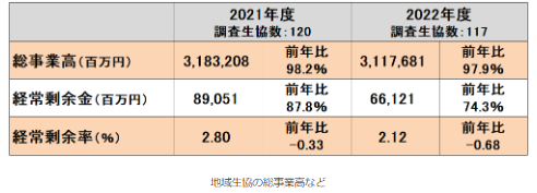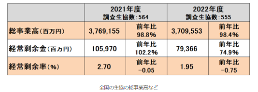 全国の生協の総事業高(「供給高」に共済、福祉など事業収入を加えた数値)は、3兆7095億円で596億円の減収(98.4%)、経常剰余金(一般企業の経常利益に相当)は793億円(74.9%)で減益となった。
