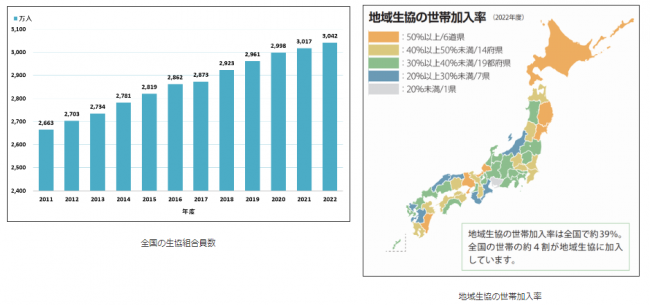 全国の生協組合員数は13年連続増加し、2022年度は3041万人と、前年から24万人増加した(前年比100.8%)。地域・職域・大学・学校含めた購買生協の合計は、組合員数は2665万人(101.1%)となった。