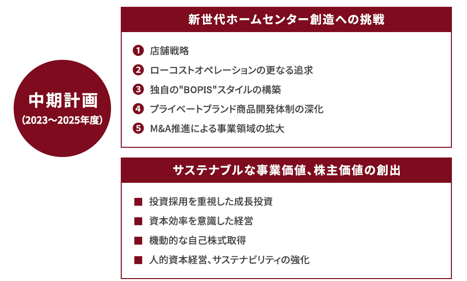 DCMホールディングスグループは、「新世代ホームセンター創造への挑戦~店舗の“再”活性化+事業領域の拡大~」を方針として、第3次中期経営計画(2023年度~2025年度)で掲げた事業戦略を進めている。