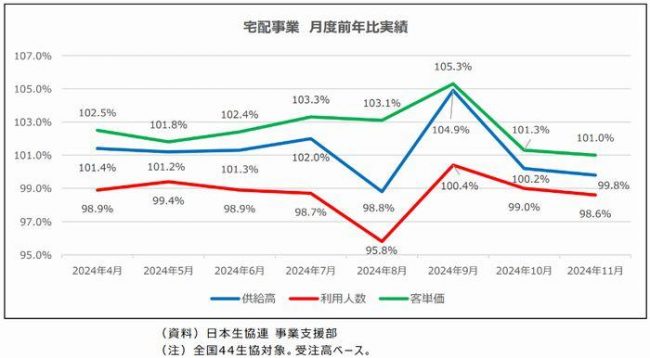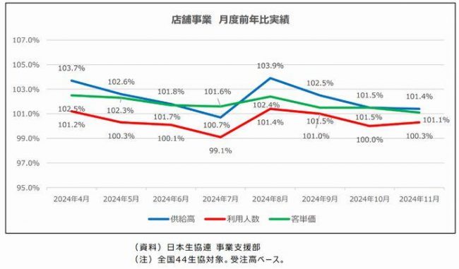 宅配事業、店舗事業の8カ月間(2024年4月度~11月度)の数値が発表された。宅配事業は、供給高が前年を上回る結果となった。利用人数、点数は回復傾向だが、点単価の上昇に支えられている(受注高:101.2% 、利用単価:102.5%、利用人数:98.7%、利用点数:98.4%)。