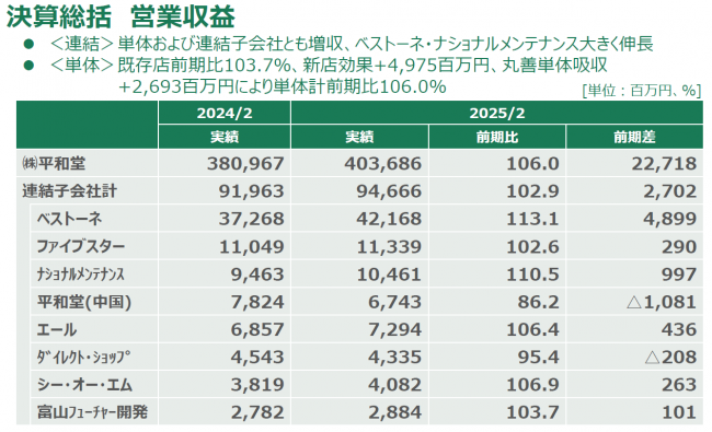 平和堂単体では増収減益だったが、連結子会社の総合小売りのエール、惣菜製造のベストーネが大幅に増収増益したことにより、連結では増収増益を確保した。