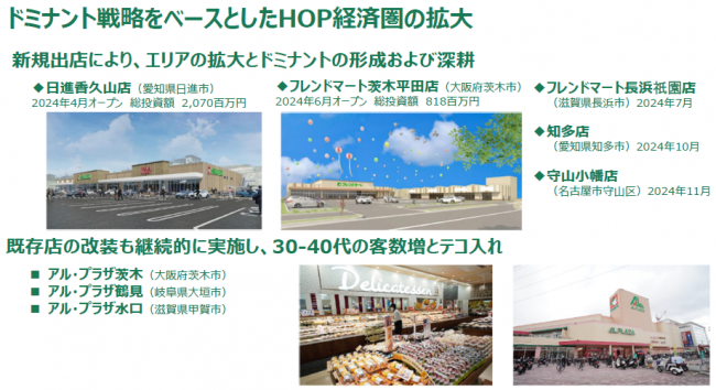 また、「生産性改善も含むコスト構造改革の推進」を重点戦略として具体的な取組みを進めている。2026年度までの「第五次中期経営計画」を策定していて、地域密着ライフスタイル総合(創造)企業を目指すべく、「子育て世代ニーズ対応による顧客支持の獲得」「ドミナント戦略をベースとしたHOP経済圏の拡大」に取り組んでいる。