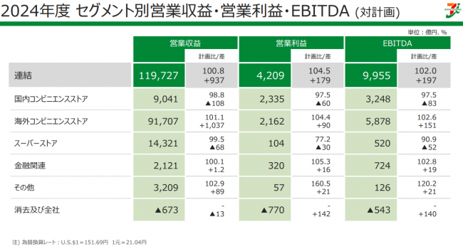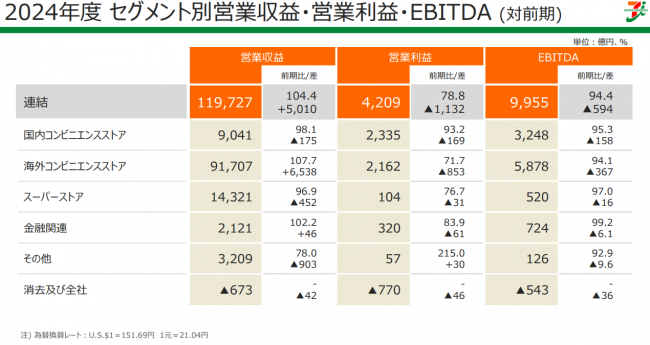 セグメント別では、国内コンビニエンスストア事業の営業収益は9041億5200万円(前年同期比98.1%)、営業利益は2335億5400万円(93.2%)。