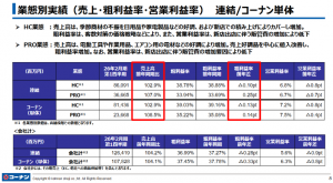 コーナン単体を見ると、HC業態は、季節商材の不振を日用品や家電製品などの好調、および新店での積み上げがカバーして増加した。粗利益率は、客数対策の価格戦略などにより、また、営業利益率は、新店出店に伴う販管費の増加により低下した。PRO業態は、電動工具や作業用品、エアコン用の電材などが好調で、売上高は増加した。売上げ好調品を中心に値入改善し、粗利益率が増加した。営業利益率は、新店出店に伴う販管費の増加要因により低下した。