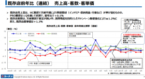 既存店売上高は、HC業態で天候不順により季節商材(インテリア・収納用品・行楽など)が伸び悩んだものの、PRO業態は1Qを通して好調で、前年比で0.1%増となった。客数は、天候要因で客足が鈍いなか、消費喚起を目的としたキャンペーン販促強化により1.2%減に抑えた。客単価は1.3%増。