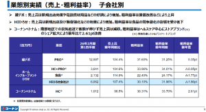 子会社の建デポは売上高が129億9700万円の前期比4.4%増、2023年6月に株式取得したホームインプルーブメントひろせも60億6200万円の7.4%増と好調だったが、コーナンベトナムは10億1200万円の1.5%減。南部地区での景気低迷で客数が伸びなかった。
