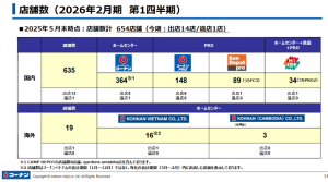 グループ全体で14店舗を出店し、1店舗を閉店した。5月末時点のグループの店舗数は654店(内訳は、国内635店、海外19店)。なお、KOHNANVIETNAM CO., LTD.の事業年度は、2025年1月1日から2025年12月31日であるため、当第1四半期の店舗数は、2024年3月31日時点の店舗数を表示した。