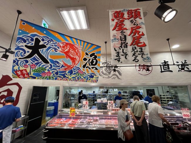 販売面では“全店の魚が良い”と評価される魚屋を作り上げるため、小型店舗でも週末の土曜日限定で対面鮮魚販売を実施するなど販売体制を拡充した結果、対面販売実施店舗数が243店舗になった。店頭では、“頭から尻尾まで見える魚屋を目指しています”と掲げたのぼりを設置し、ルビットアプリのマイ店舗登録機能を用いてその地域の顧客に配信する販促活動も強化している。
