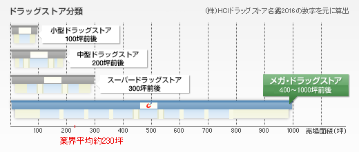 カワチ薬品は三つのフォーマットを展開している。「メガ・ドラッグストア」と自称する300坪前後のスーパードラッグストア、それから200坪前後の中型ドラッグストア、そして100坪前後の小型ドラッグストアである。