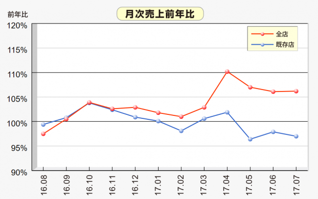 (株)イズミ(広島市、山西泰明社長)の2017年7月度の実績は、既存店ベースが前年比97.0%であるのに対し、全店ベースでは106.2%と好調だ。これはLECT(広島市)をはじめとする新店が好調なことと、昨年は4月に熊本地震が発生して震災特需が起こり、その反動によるものである。