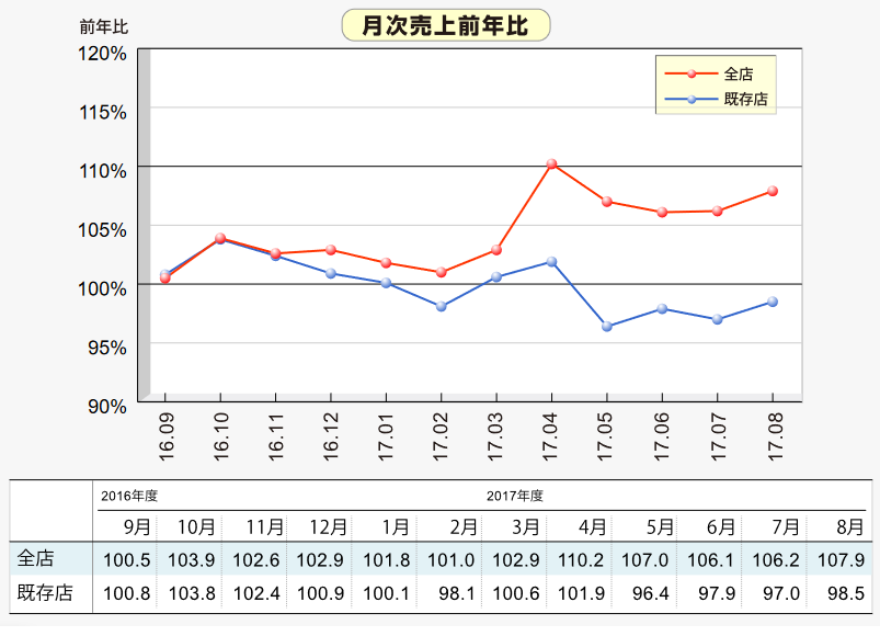 売上高を時系列で追うと、2016年から2017年の既存店ベースと全店ベースの売上前年比の推移は、2016年の11月までは同じ水準で推移するが、それ以降は全店ベースが既存店ベースを次第に引き離している。やはり新店効果が大きいことがわかる。