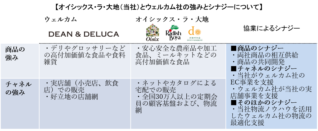 オイシックス・ラ・大地(株)(東京都品川区、高島宏平社長)は、5月21日(火)、DEAN&DELUCA(ディーン&デルーカ)などを展開する(株)ウェルカム(東京都渋谷区、横川正紀社長)と資本業務提携すると発表した。