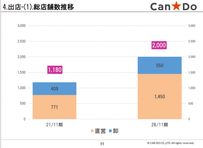 イオン(株)(千葉市美浜区、吉田昭夫社長)は1月14日(金)、子会社化した100円ショップ(株)キャンドウ(東京都新宿区、城戸一弥社長)の店舗数を、5年後の2026年11月期に2000店舗体制にすると発表した。21年11月期の店舗数は1180店舗。820店舗増となる。