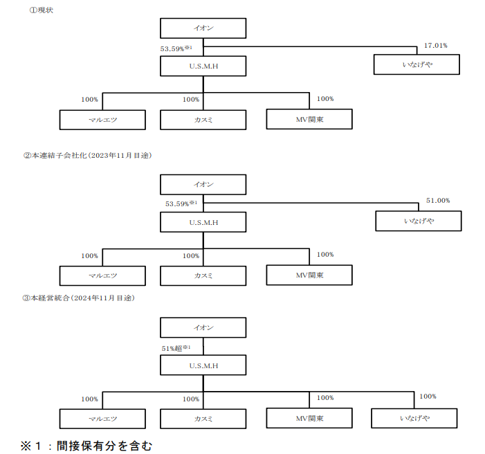 イオンは 2023年11月を目途に、いなげやの議決権の51%に相当する数の株式を取得の上限として、いなげやの株式を取得し、いなげやを連結子会社とするための手続きを行う。