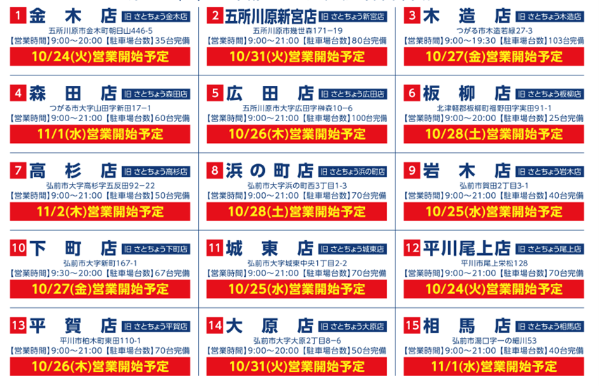 (株)トライアルホールディングス(福岡市東区、亀田晃一社長)および傘下の(株)青森トライアル(福岡県福岡市、柏村昌弘社長)は、9月に(株)佐藤長から譲り受けた食品スーパーマーケット18店舗を10月24日(火)から順次営業を再開する。