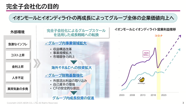 イオンの吉田昭夫社長は「イオングループは自主自立を基本にして成長してきた。それは変わらない。ただしイオンモールの有するプラットフォームとイオンディライトのもつインフラはいずれも大きな機能。グループのリソースを当てて再成長をスピードアップさせていく」と子会社化する狙いを語っている。