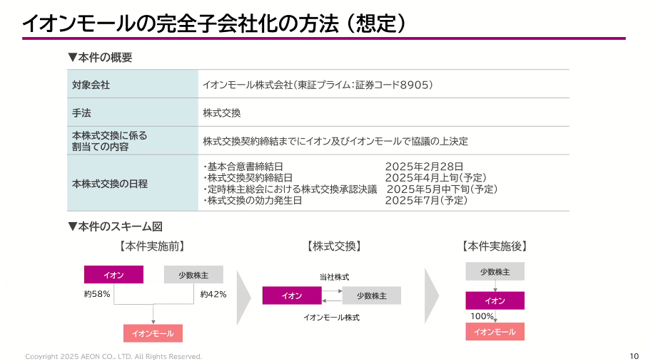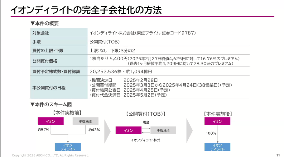 2月28日付でイオンモールと株式交換による完全子会社化に向けた協議を開始することの基本合意書を締結した。またイオンディライトの株式については公開買い付けによって完全子会社化する。完全子会社化を通じてイオングループのもつスケーラビリティを活かし、イオンモールとイオンディライトの再成長を図る。