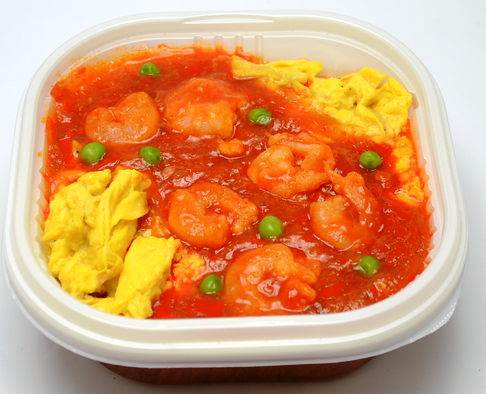 「夏丼 ピリ辛海老チリ」は、唐辛子と豆板醤を炒めた辛味のあるチリソースで、炒めた玉子を加えた。
