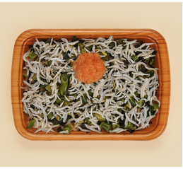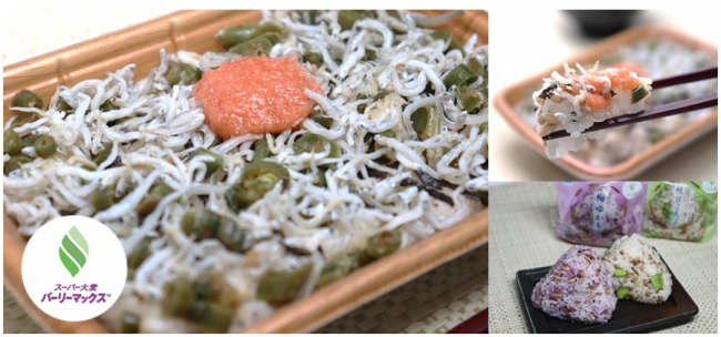 「明太しらすごはん」は、食物繊維が多く含まれているスーパー大麦を使用しただし飯に、きざみのり・インゲン青菜おかか炒め、しらすをのせ、さらに明太子和えがトッピングされている。
