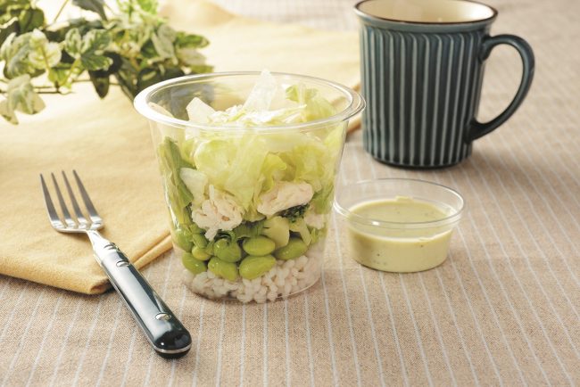 「緑のまぜまぜサラダ」は、枝豆・レタス・ブロッコリー・グリーンリーフの4種類の緑の野菜に、プチプチした食感が特徴のもち麦と蒸し鶏を加えた。青汁飲料などに使用されるケール粉末を加えたシーザードレッシングを添付している。(税込み330円)