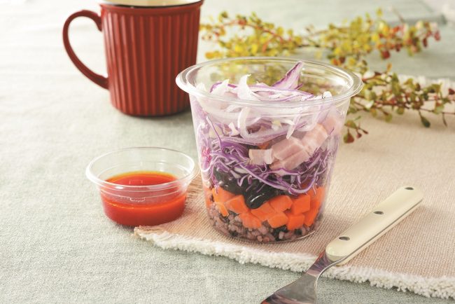 今回発売するサラダは、層になった野菜の彩りが鮮やかで、食欲がそそられる。これ1品でも野菜がしっかりと摂れる。縦型カップで持ちやすく、オフィスのデスクのような狭い場所でも食べやすいように工夫してある。