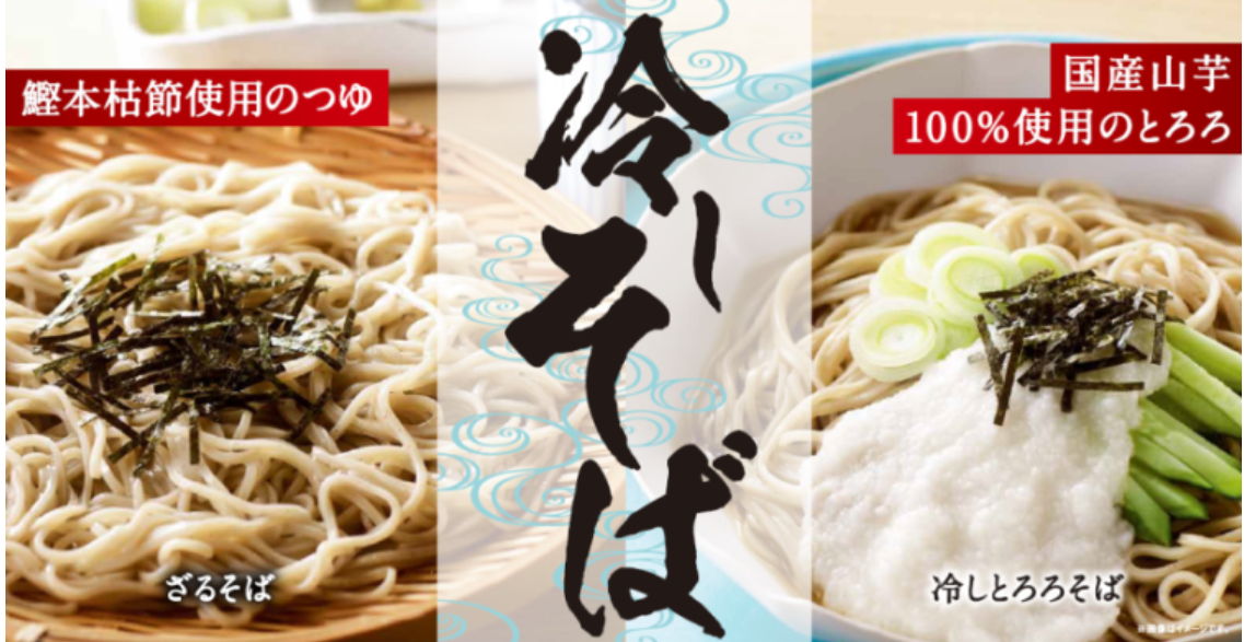 商品は、ざるそば(税込340円)、冷しとろろそば(460円)、ミニ冷しとろろそば(350円)、冷し鶏そば(450円)の4種。