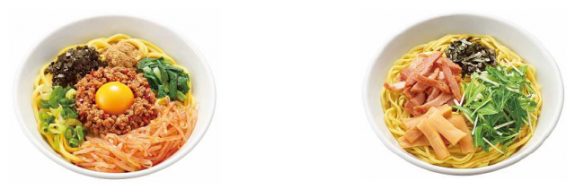 「台湾旨辛まぜそば」(税込み498円:写真左)は、 店舗の看板メニュー「台湾まぜそば」を再現した一品。独特の肉味噌とかえし醤油を使用している。にんにくと別添えの黒胡椒がアクセントになっており、トッピングされた卵黄風ソースとからめると、まろやかな味わいが楽しめる。