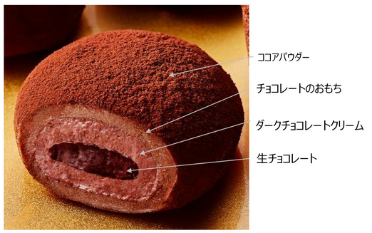 生チョコレートを、ダークチョコレートクリームの中に閉じ込め、それを柔らかいチョコレートを練りこんだ餅で包んだ。つまり3層仕立てのスイーツ。餅の周りにはココアパウダーをまぶして、トリュフ風に仕上げている。