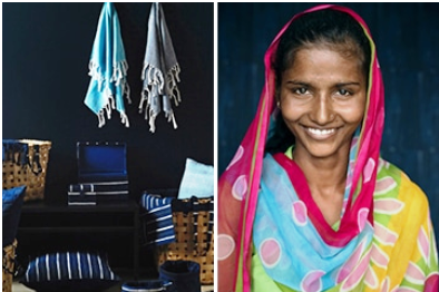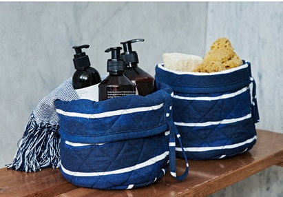 天然素材を使った伝統的手工芸のコレクションには、手織り・手刺繍のクッションカバー、キッチンクロス、バスケット、ボックスなどが揃っている。ブルーと天然素材の美しい組み合わせは、インドの伝統的織物からインスピレーションを得ている。