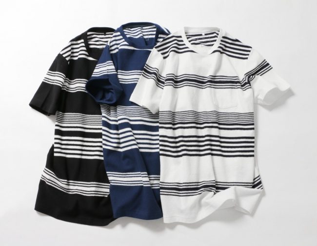 発売される商品は、メンズ・レディスの2型。メンズはボーダーデザインのポケット付きTシャツ。M・L・LLの3サイズで、ホワイト・ブルー・ブラックの3色。
