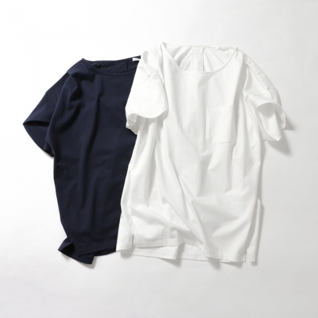レディスはポケット付きビッグTシャツ。M・Lの2サイズで、ホワイト・ネイビーの2色。本体価格はすべて2800円。