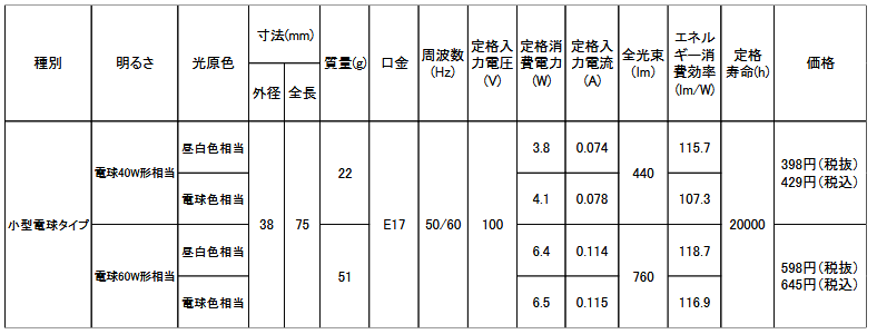 小型タイプの「E17口金」は、40W形相当で398円、60W形相当で598円(ともに本体価格)。広配光タイプを採用した昼白色と電球色の2種類ある。脱衣所や浴室の密閉形器具にも対応する汎用タイプ。2017年度省エネ法目標基準値を満たしていて、白熱電球と比べて電気代を約88%カットすることができる。