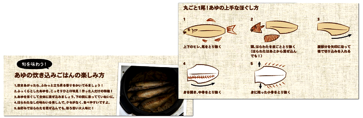 新商品は、徳島県産の身がふっくらとした鮎が3尾入っている炊き込みご飯。魚の扱いが苦手な人でも失敗することがないよう、鮎のほぐし方を説明したイラストが付いている。鮎のハラワタをとり除けば、子ども向けに、ハラワタを一緒に混ぜ込めば、鮎の苦みを味わえる大人向けの炊き込みご飯となる。