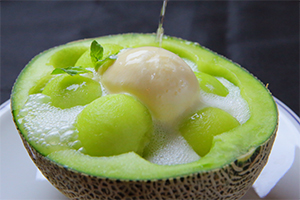 山形県産アンデスメロンは、高い糖度と芳醇な香りが特長だ。そのメロンをくりぬいた器から、シャンパンとメロンの香りが弾け出る。メロン、シャンパン、バニラジェラートの、3種類の味の変化がお客を楽しませてくれる。